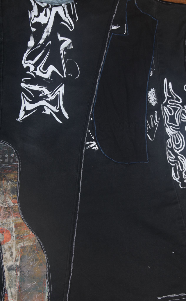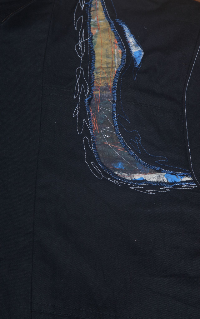 A mixed media creation using embroidery, printing, patchwork, appliqué. Constructed with second hand materials only including denim, corduroy, cotton, linen. Lined with shirt fabric for extra warmth. Wearable piece of art.