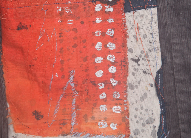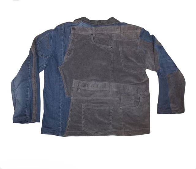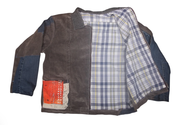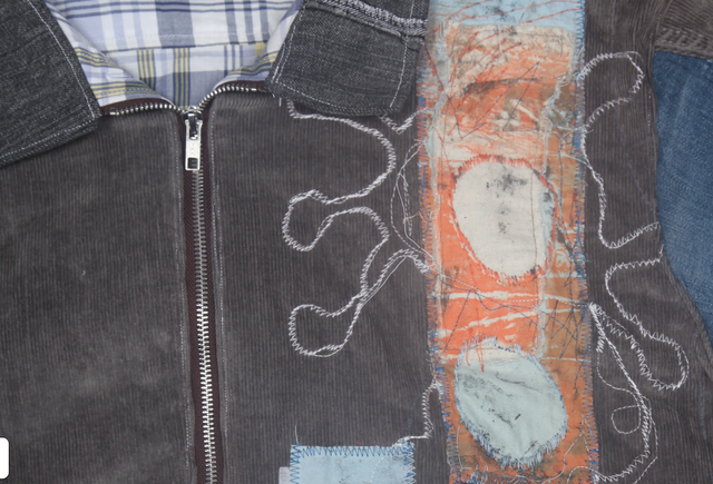 A mixed media creation using embroidery, printing, patchwork, appliqué. Constructed with second hand materials only including denim, corduroy, cotton, linen. Lined with shirt fabric for extra warmth. Wearable piece of art.